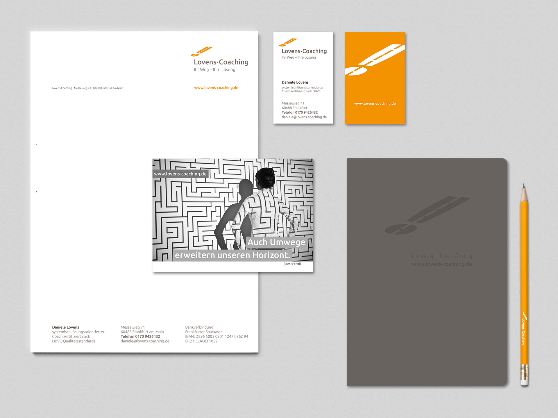 Logoentwicklung, Geschäftspapiere, Werbemittel und Website für eine Coachin aus Frankfurt am Main